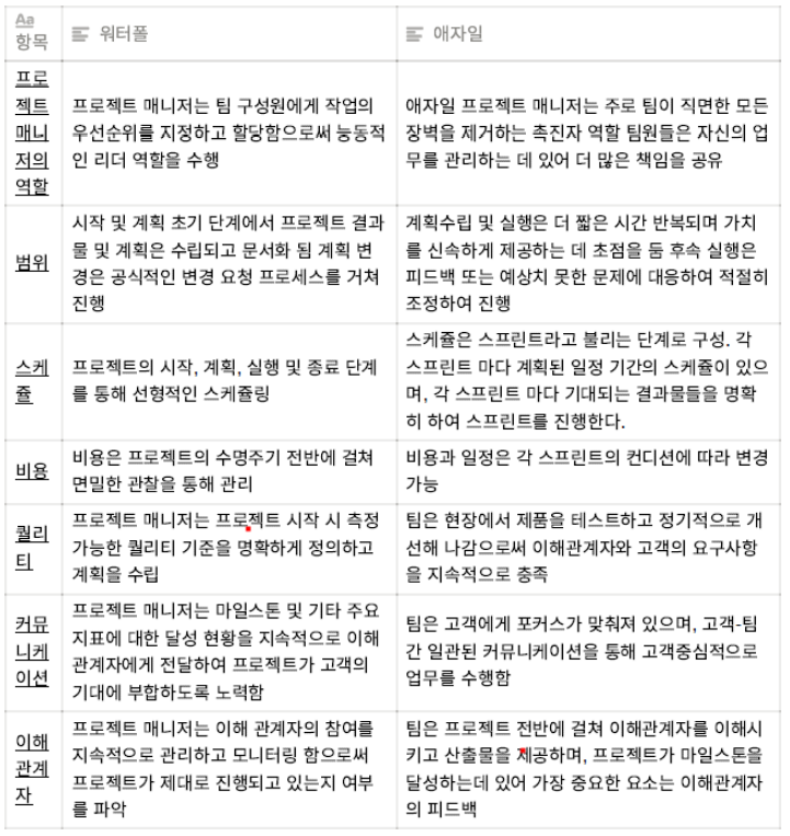 워터폴과 애자일을 비교하여 이해함으로써 어떤 방식이 내가 진행하는 프로젝트에 더 효과가 있을지 판단할 수 있습니다.